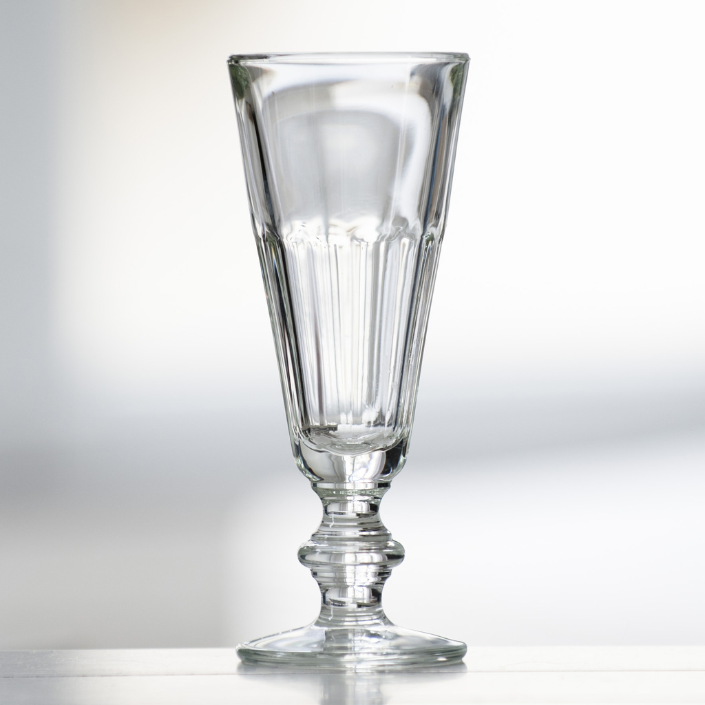 Sechs elegante Champagnergläser in klassischer Facettenschliff-Optik nach einer im 19. Jahrhundert beliebten und weit verbreiteten französischen Form. Hergestellt aus robustem Pressglas bei La Rochère.