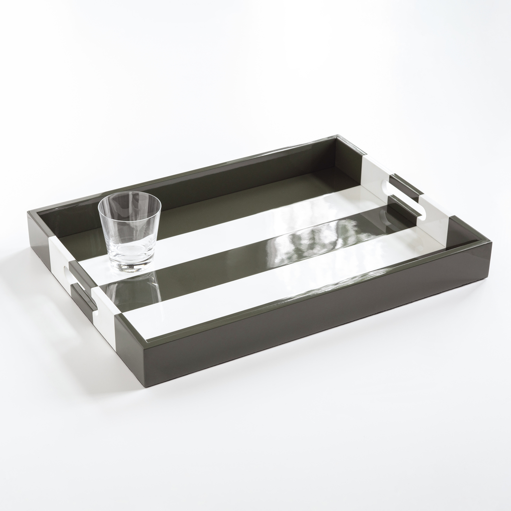 Sommerlaune garantiert! Großes, hochglanzlackiertes Tablett mit markanten Blockstreifen, wie man sie von Markisen oder Strandkörben kennt. Mit hohem Rand und stabil genug, um jede Menge Geschirr oder Getränke sicher in den Garten zu transportieren. Griffe an den kurzen Seiten. Der mit Velours kaschierte Boden verhindert Kratzer auf empfindlichen Untergründen.