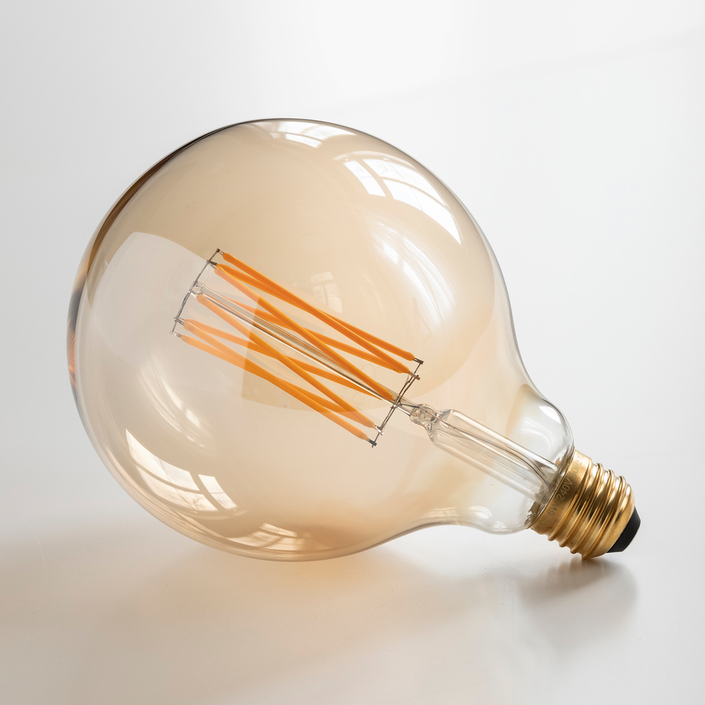 Extra großes, globusförmiges LED-Leuchtmittel des Londoner Lichtdesignstudios Tala, das auf die Gestaltung von LED-Beleuchtung mit warmem, kerzenlichtähnlichem Charakter spezialisiert ist. Das herrlich bernsteinfarbene Licht der kohlefadenartigen Filament-LED wird hier durch eine sanfte Tönung des Glaskörpers gefiltert und gewinnt dadurch nochmals an Ausstrahlung.