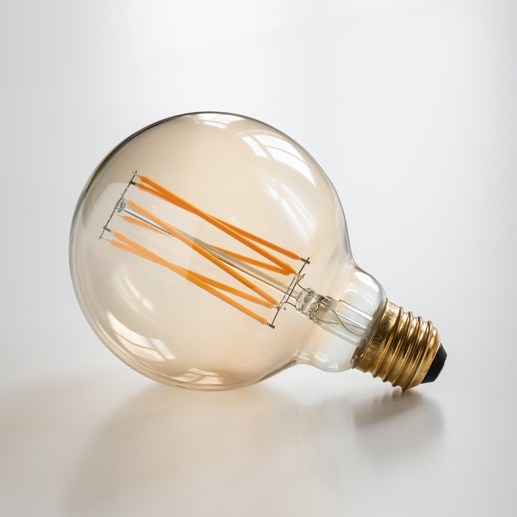 Großes, globusförmiges LED-Leuchtmittel des Londoner Lichtdesignstudios Tala, das auf die Gestaltung von LED-Beleuchtung mit warmem, kerzenlichtähnlichem Charakter spezialisiert ist. Das herrlich bernsteinfarbene Licht der kohlefadenartigen Filament-LED wird hier durch eine sanfte Tönung des Glaskörpers gefiltert und gewinnt dadurch nochmals an Ausstrahlung.