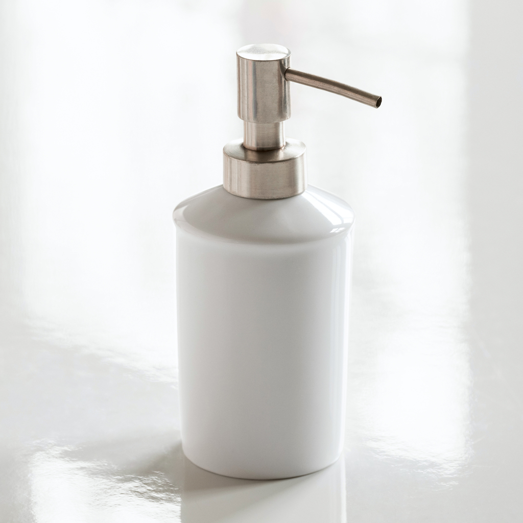 Der Seifenspender gehört zu einer klassisch schlichten Badezimmerserie aus reinweißem Hartporzellan, die für Torquato in der oberfränkischen Porzellanmanufaktur Lindner gefertigt wird. Der 1928 gegründete Hersteller von Liebhaberporzellan ist eine echte Ausnahmeerscheinung in der Branche, denn in Küps wird bis heute in alter Handwerkstradition mit hochspezialisierten, teilweise selbst ausgebildeten Mitarbeitern produziert und jede Gussform sorgsam aufbewahrt, sodass im Laufe der Jahrzehnte ein Archiv von über 30.000 Formen entstanden ist, von denen zahlreiche für Torquato reaktiviert wurden. Pumpenkopf aus Edelstahl.