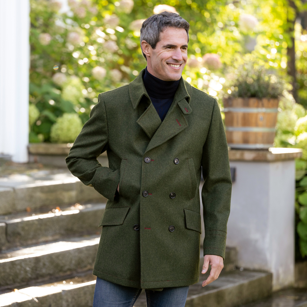 Warme, zweireihige Jacke aus grünem Loden (386 g/m²) aus reiner Wolle. Dick wattiert und damit wirklich winddicht und kältetauglich. Der breite Kragen kann hochgeschlagen und mit einer Lasche geschlossen werden, sodass man im Zweifel auf den Schal verzichten kann. Ein schönes Detail sind die bei näherem Hinsehen erkennbar rot gefassten Knopflöcher und Nähte. Angedeutete Ärmelaufschläge, Rückenschlitz, zwei große Pattentaschen, Handwärmtaschen und Innentaschen.