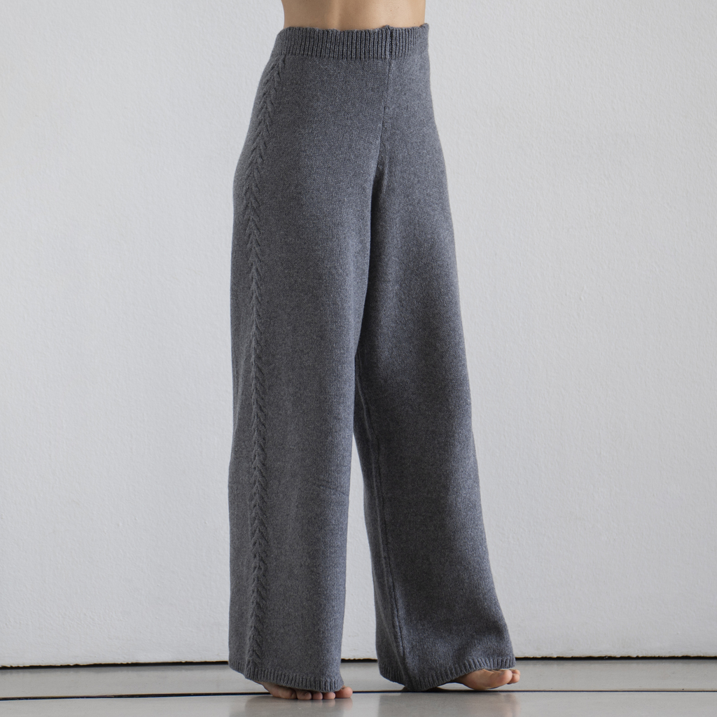 Außerordentlich bequem, mit sehr weitem Bein geschnittene Hose aus extrafeiner, reiner Wolle vom Merinoschaf. Mit elastischem Rippenstrickbund für komfortablen Sitz und Kabelstrickdetailsan an den Seiten der Hosenbeine. Aus Irland.