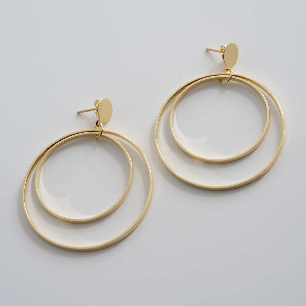 Dekorative, bewegliche Ohrhänger mit zwei unterschiedlich großen, in einer gemeinsamen Fassung gelagerten Ringen aus dem Atelier von Marjana von Berlepsch. Steckverschluss mit poliertem Abdeckplättchen. Von Hand hergestellt. Ø 5 cm und 3,5 cm.