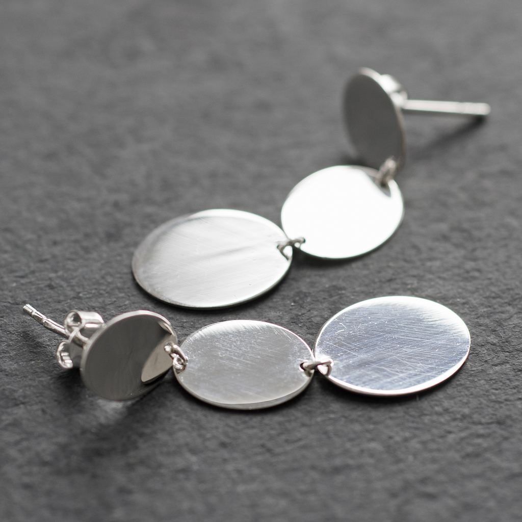 Feine, flache Plättchen-Ohrringe aus dem Hamburger Atelier von Marjana von Berlepsch, die seit einigen Jahren mit großem Erfolg ihre eigene, betont minimalistisch-elegante Schmucklinie entwirft und bei Gold- und Silberschmieden in Deutschland fertigen lässt. Alle ihre Entwürfe strahlen stets eine angenehme Leichtigkeit aus, ohne dabei belanglos oder simpel zu wirken. Die Ohrringe bestehen jeweils aus drei unterschiedlich großen Plättchen aus Sterlingsilber 925 und sind blank oder vergoldet (18 Karat) lieferbar.