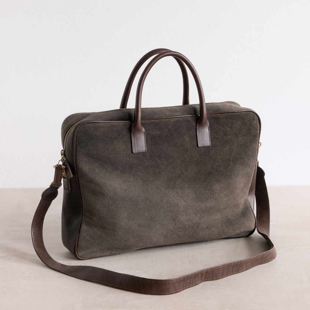 Klassische Aktentasche aus weißgegerbtem Hirschleder. Mit Tragegurt, rund vernähten Henkeln, Keder und Seitenbesatz aus braunem Glattleder. Reißverschlussöffnung. Großer Innenraum mit Seitenfach für lose Unterlagen oder einen kleineren Laptop (max. 16 Zoll), zwei Reißverschlusstaschen, zwei kleinen Steckfächern und Stiftschlaufe. Rotes Canvasfutter, Metallbeschläge aus massivem Messing.