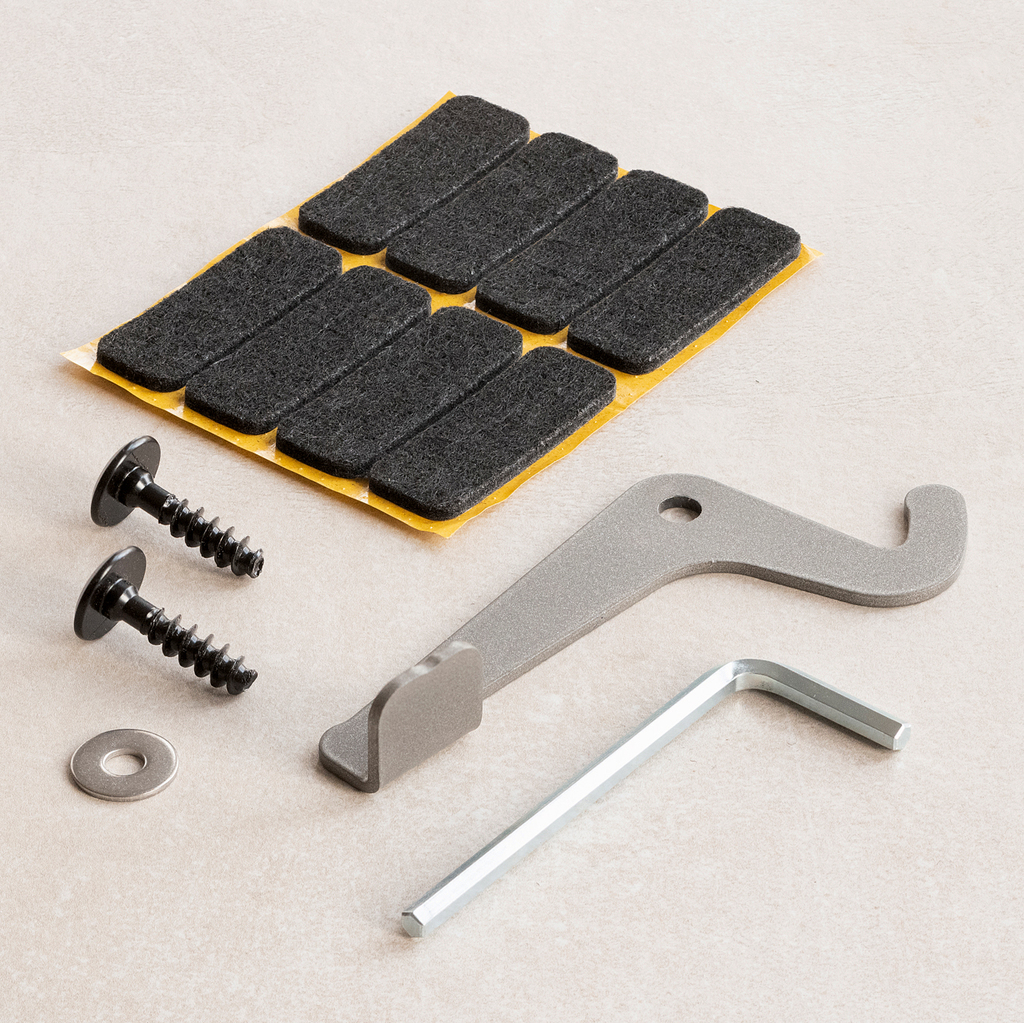 Set für den NHOrD TriaTrainer mit 8 Filzgleitern zum Schutz empfindlicher Böden, verlängertem Sicherungshaken und Montagewerkzeug.