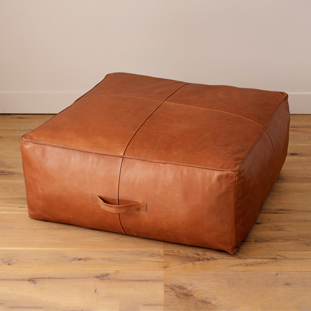 Großer Pouf, der mit seiner quadratischen Grundfläche und dem zeitlosen Bezug aus hellbraunem Büffelleder in unterschiedlichste Interieurs passt: Zum Füßehochlegen am Lieblingssessel, als Zeitschriftenablage am Sofa oder als zusätzliche Sitzmöglichkeit, wenn viele Gäste da sind. Auf der Fläche der großen Variante (1 x 1 m) kann man sogar zu mehreren sitzen. Jede Seite des Würfels ist durch die notwendigen Nähte und zusätzlichen Ziernähte optisch in vier Teile geteilt. Die Sitzfläche ist mit einer umlaufenden Kedernaht betont. Das Büffelleder wird in Fassgerbung in einer rotierenden, offenen Trommel rein pflanzlich gegerbt und dort anschließend auch gefärbt. Dadurch entsteht ein sehr weiches und dennoch stabiles Leder, das mit der Zeit sehr schön altert. Unterseite aus reiner Baumwolle.