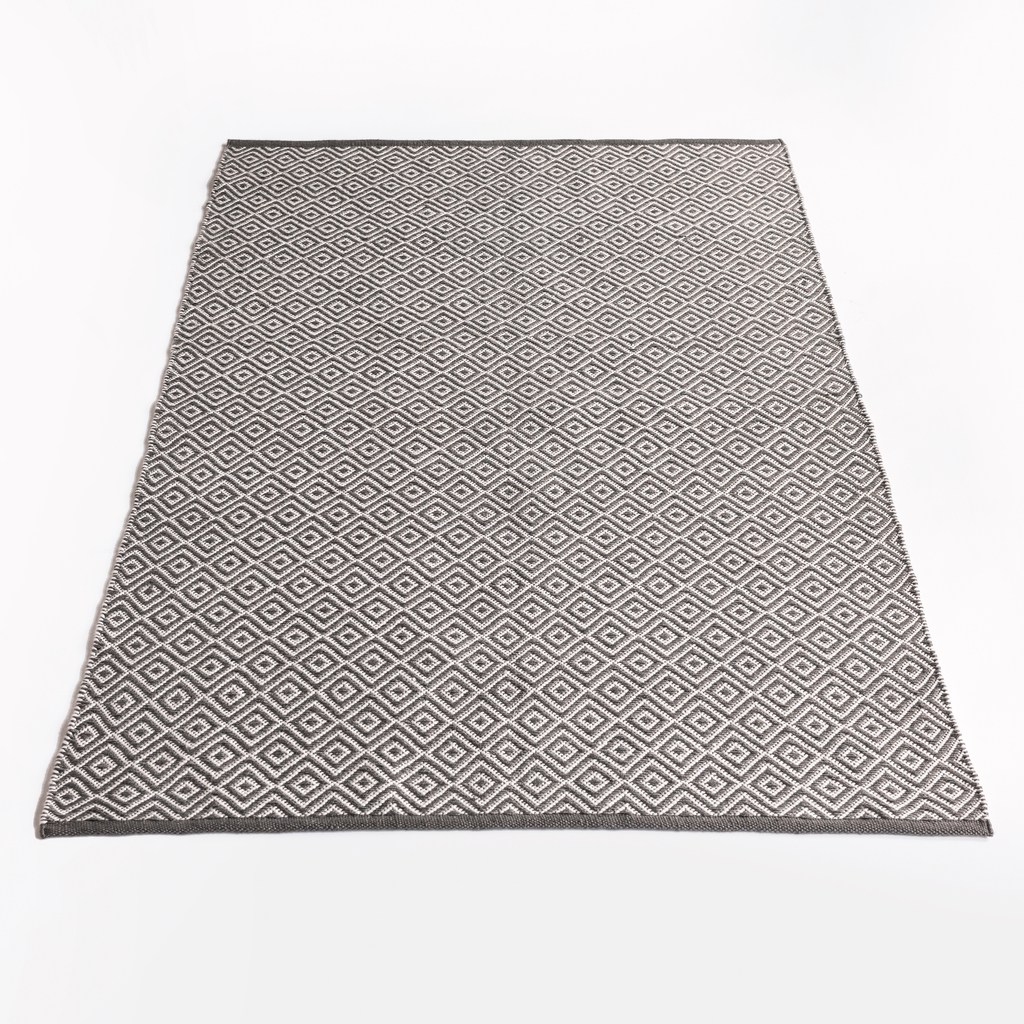 Diese Teppiche sind speziell für die Verwendung auf der Terrasse oder auf dem Balkon gedacht, wo sie für mehr Gemütlichkeit sorgen. Sie sind aus wiederverwerteten PET-Flaschen hergestellt, aus denen nach dem Zermahlen zu feinen Flocken neue Polyesterfasern entstehen, die wiederum zu Webgarn versponnen werden. Das Verfahren ist deutlich ressourcenschonender als die petrochemische Gewinnung neuer Fasern aus Erdöl. Die Teppiche sind wasserfest und trocknen schnell, sodass sie tatsächlich die ganze Saison über liegenbleiben können.