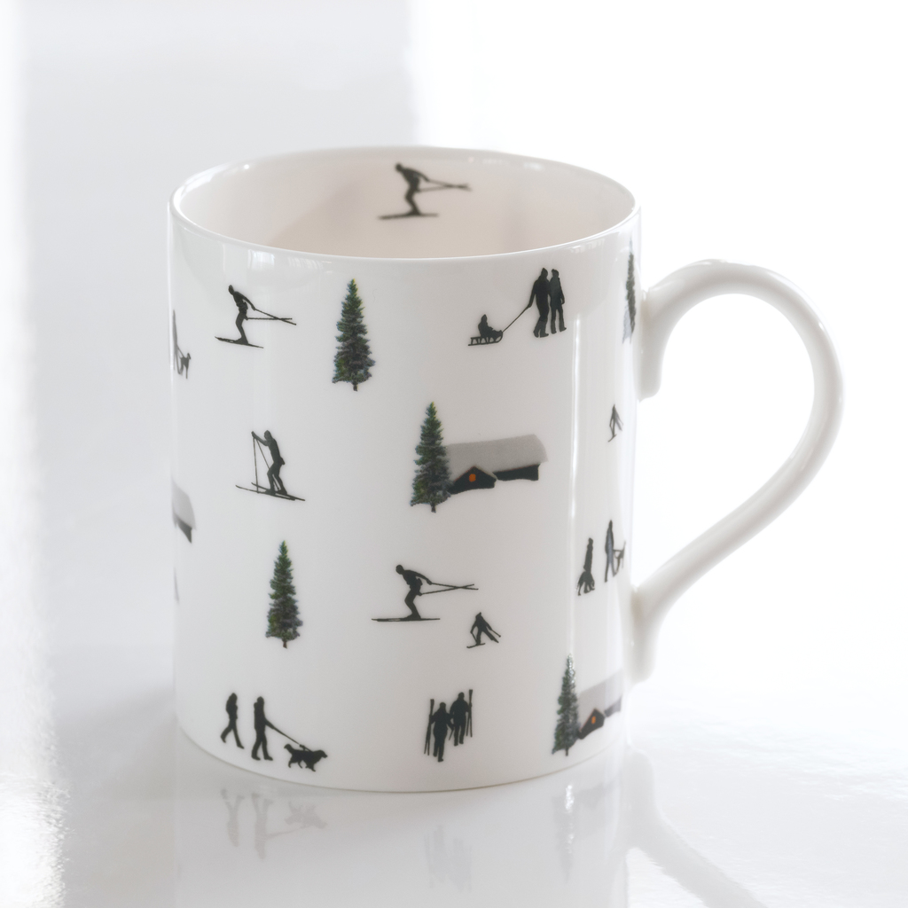 Aus weißem, wunderbar transluzentem Fine Bone China gefertigter Becher mit farbenfrohen Skifahrermotiven. Alle Illustrationen stammen von der Londoner Künstlerin und Fotografin Natasha Durlacher und feiern den Schnee und die Schönheit des alpinen Lebens. Als Geschenk für Menschen, die die Berge lieben, als winterliche Geschirrergänzung für zuhause oder die Berghütte. Hergestellt in einer britischen Porzellanmanufaktur.