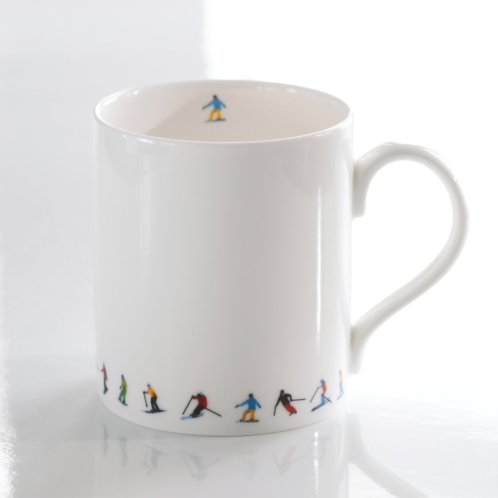 Aus weißem, wunderbar transluzentem Fine Bone China gefertigter Becher mit farbenfrohen Skifahrermotiven. Alle Illustrationen stammen von der Londoner Künstlerin und Fotografin Natasha Durlacher und feiern den Schnee und die Schönheit des alpinen Lebens. Als Geschenk für Menschen, die die Berge lieben, als winterliche Geschirrergänzung für zuhause oder die Berghütte. Hergestellt in einer britischen Porzellanmanufaktur.
