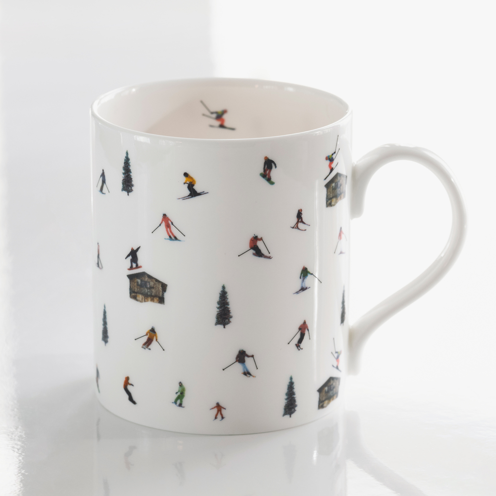 Aus weißem, wunderbar transluzentem Fine Bone China gefertigter Becher mit farbenfrohen Skifahrermotiven. Alle Illustrationen stammen von der Londoner Künstlerin und Fotografin Natasha Durlacher und feiern den Schnee und die Schönheit des alpinen Lebens. Als Geschenk für Menschen, die die Berge lieben, als winterliche Geschirrergänzung für zuhause oder die Berghütte. Hergestellt in einer britischen Porzellanmanufaktur.