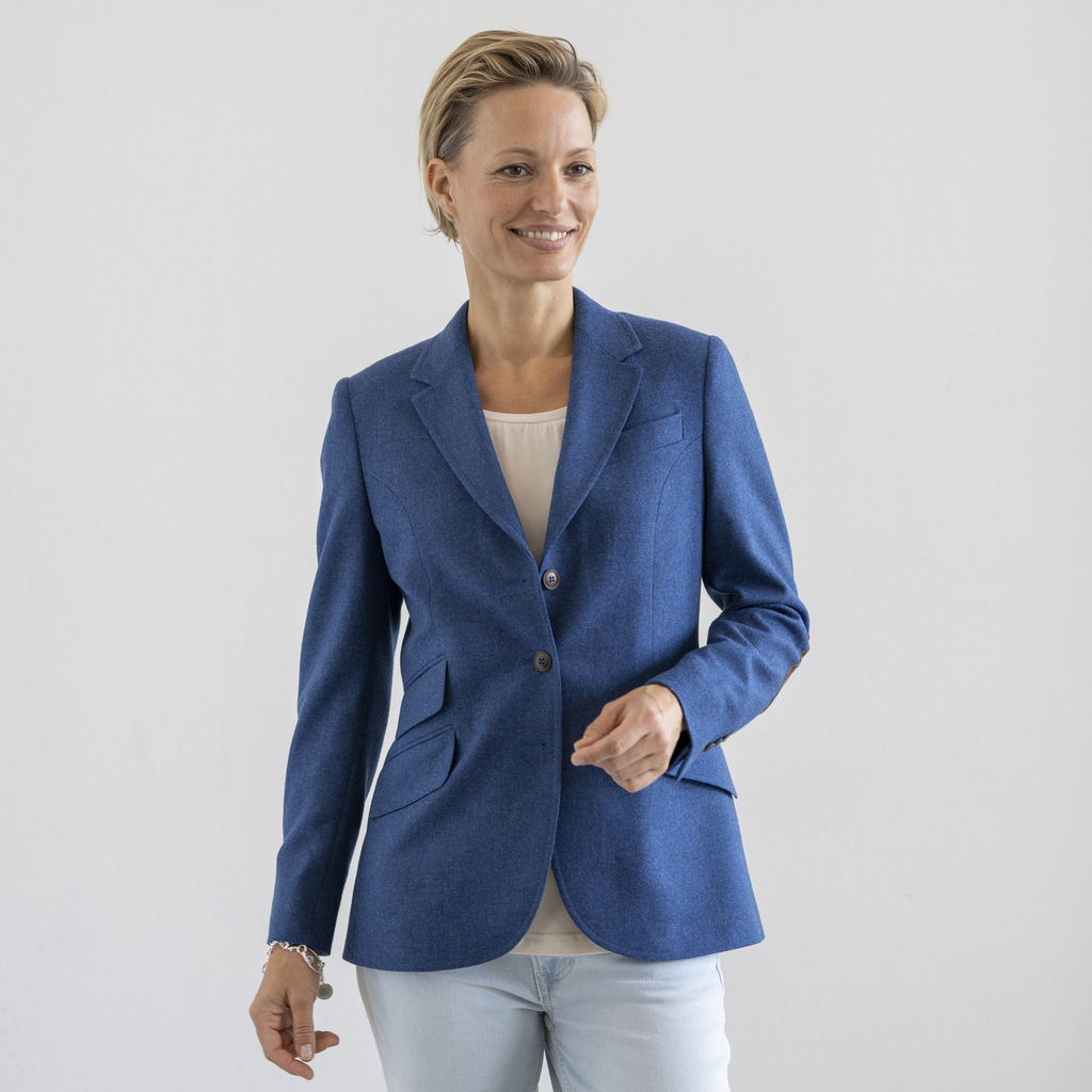 Kornblumenblauer Blazer aus mittelschwerem Tweedgewebe aus reiner Wolle. Das Gewebe stammt aus der 1948 gegründeten Piemonteser Weberei Lanificio di Pray zwischen Turin und Mailand und ist ein Musterbeispiel für italienischen Tweed: weich, anschmiegsam und nicht zu dick, aber trotzdem angenehm stabil und warm. Klassischer, sportlich-taillierter Schnitt mit Ellbogenpatches, 3 Hornknöpfen, 2 Rückenschlitzen, fallendem Revers, schrägen Taschen mit Billetttasche, Brusttasche und Innentasche. Gepunktetes Innenfutter.