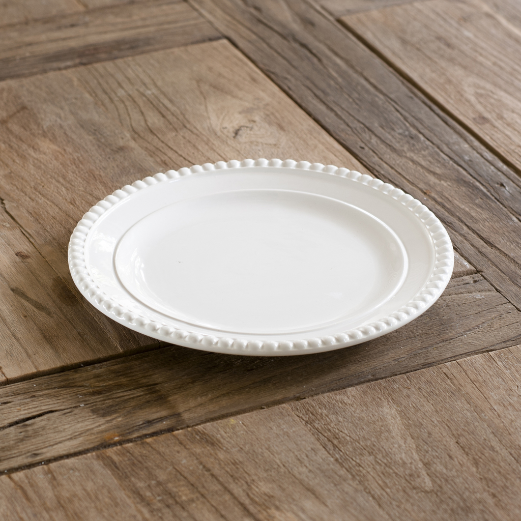 Salatteller aus Steingut, der auf traditionelle Weise im sogenannten Schlickgußverfahren für uns hergestellt wird: Die flüssige Keramikmasse wird dabei in Gipsformen gegossen und unter Druck getrocknet - bis heute ist für die Herstellung der Formen Gips das optimale Material, da es nicht nur leicht geformt und glatt poliert werden kann, sondern den Gußstücken aktiv Wasser entzieht und so die Trocknung verbessert. Nach dem Guß werden alle Teile zunächst bei 1050 °C vorgebrannt. Nach dem Auftragen einer opaken, milchig-weißen Glasur, die der fertigen Oberfläche einen feinen Tiefenglanz verleiht, erfolgt ein nochmaliges Brennen bei 1000 °C. Alle Teile dieser Serie sind an ihrem äußeren Rand mit einem sogenannten Perlstab geschmückt: Dieses Motiv, bei dem kleine, perlenförmige Kugeln gleichmäßig aneinandergereiht sind, erinnert tatsächlich an eine Perlenkette und diente bereits in der griechisch-römischen Antike als architektonisches Dekorelement für Rahmen, an Säulen, Giebeln und Gesimsen. In der 2. Hälfte des 18. Jahrhunderts kam es im Zuge des einsetzenden Klassizismus auch als Dekorelement für kunsthandwerkliche Gegenstände wieder zunehmend in Mode und gehörte aufgrund seiner vornehme Schlichtheit ausstrahlenden Anmutung über mehrere Stilepochen hinweg - vom Louis XVI. über das Directoire bis zum Empire, dem englischen Regency und dem deutschen Klassizismus - zu den beliebtesten ornamentalen Motiven.