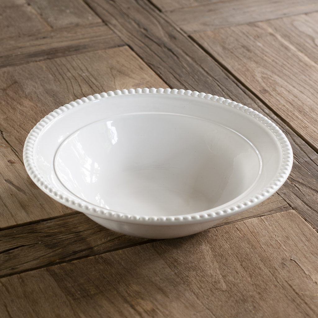 Mittlere Schüssel aus Steingut, die auf traditionelle Weise im sogenannten Schlickgußverfahren für uns hergestellt wird: Die flüssige Keramikmasse wird dabei in Gipsformen gegossen und unter Druck getrocknet - bis heute ist für die Herstellung der Formen Gips das optimale Material, da es nicht nur leicht geformt und glatt poliert werden kann, sondern den Gußstücken aktiv Wasser entzieht und so die Trocknung verbessert. Nach dem Guß werden alle Teile zunächst bei 1050 °C vorgebrannt. Nach dem Auftragen einer opaken, milchig-weißen Glasur, die der fertigen Oberfläche einen feinen Tiefenglanz verleiht, erfolgt ein nochmaliges Brennen bei 1000 °C. Alle Teile dieser Serie sind an ihrem äußeren Rand mit einem sogenannten Perlstab geschmückt: Dieses Motiv, bei dem kleine, perlenförmige Kugeln gleichmäßig aneinandergereiht sind, erinnert tatsächlich an eine Perlenkette und diente bereits in der griechisch-römischen Antike als architektonisches Dekorelement für Rahmen, an Säulen, Giebeln und Gesimsen. In der 2. Hälfte des 18. Jahrhunderts kam es im Zuge des einsetzenden Klassizismus auch als Dekorelement für kunsthandwerkliche Gegenstände wieder zunehmend in Mode und gehörte aufgrund seiner vornehme Schlichtheit ausstrahlenden Anmutung über mehrere Stilepochen hinweg - vom Louis XVI. über das Directoire bis zum Empire, dem englischen Regency und dem deutschen Klassizismus - zu den beliebtesten ornamentalen Motiven.