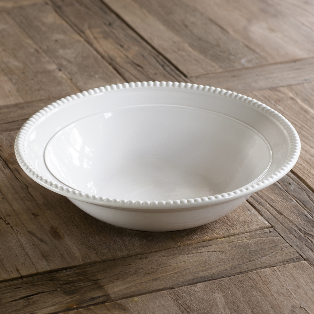 Große Schüssel aus Steingut, die auf traditionelle Weise im sogenannten Schlickgußverfahren für uns hergestellt wird: Die flüssige Keramikmasse wird dabei in Gipsformen gegossen und unter Druck getrocknet - bis heute ist für die Herstellung der Formen Gips das optimale Material, da es nicht nur leicht geformt und glatt poliert werden kann, sondern den Gußstücken aktiv Wasser entzieht und so die Trocknung verbessert. Nach dem Guß werden alle Teile zunächst bei 1050 °C vorgebrannt. Nach dem Auftragen einer opaken, milchig-weißen Glasur, die der fertigen Oberfläche einen feinen Tiefenglanz verleiht, erfolgt ein nochmaliges Brennen bei 1000 °C. Alle Teile dieser Serie sind an ihrem äußeren Rand mit einem sogenannten Perlstab geschmückt: Dieses Motiv, bei dem kleine, perlenförmige Kugeln gleichmäßig aneinandergereiht sind, erinnert tatsächlich an eine Perlenkette und diente bereits in der griechisch-römischen Antike als architektonisches Dekorelement für Rahmen, an Säulen, Giebeln und Gesimsen. In der 2. Hälfte des 18. Jahrhunderts kam es im Zuge des einsetzenden Klassizismus auch als Dekorelement für kunsthandwerkliche Gegenstände wieder zunehmend in Mode und gehörte aufgrund seiner vornehme Schlichtheit ausstrahlenden Anmutung über mehrere Stilepochen hinweg - vom Louis XVI. über das Directoire bis zum Empire, dem englischen Regency und dem deutschen Klassizismus - zu den beliebtesten ornamentalen Motiven.