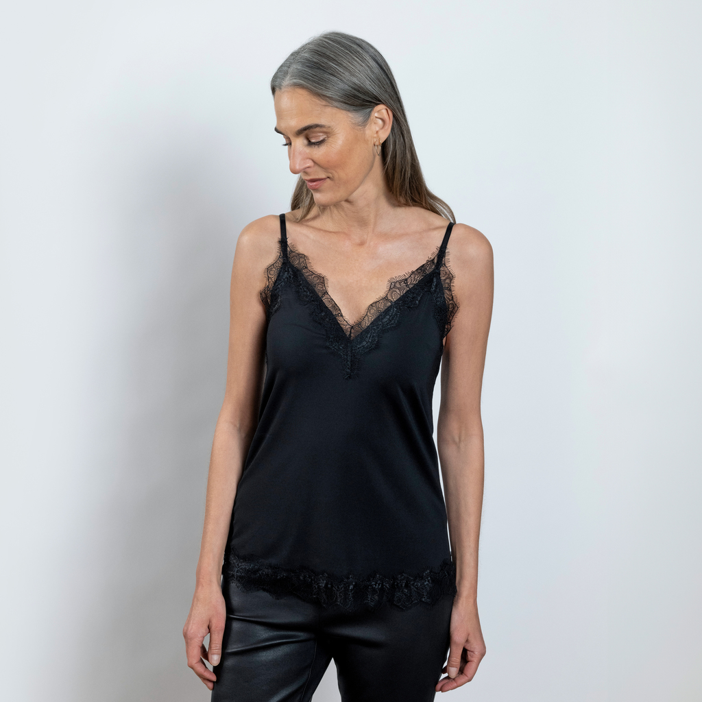 Weich fallendes, feminines Top mit feiner Spitzenborte an Ausschnitt und Saum sowie verstellbaren Spaghettiträgern. Als Basic-Kleidungsstück lässt es sich elegant-sportlich mit Blazer und Lederhose kombinieren oder auch lässig unter einem Pullover oder offenem Hemd zur Jeans tragen.