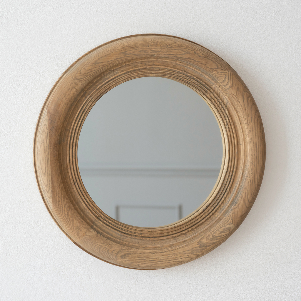 Runder Spiegel mit breitem, aufwändig reliefiertem Rahmen aus massivem, intensiv gemasertem Eichenholz mit schönem Vintage-Effekt. Mit Haken zum Aufhängen.