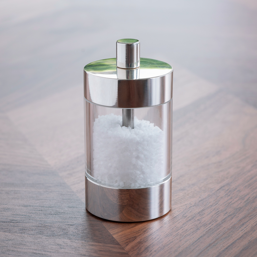 Basis und Aufsatz dieser schweren, reduziert und funktional gestalteten Mühlen sind aus versilbertem Messing gefertigt. Der eigentliche Behälter besteht jedoch aus transparentem Acrylglas, so dass Salz und Pfeffer nicht mit dem Metall in Berührung kommen. Das Mahlwerk der Pfeffermühle ist aus Edelstahl hergestellt, jenes der Salzmühle aus Gründen der Korrosionsbeständigkeit aus Keramik. Die Salzmühle eignet sich nur für vollständig trockenes Salz. Beide Mahlwerke sind stufenlos verstellbar.