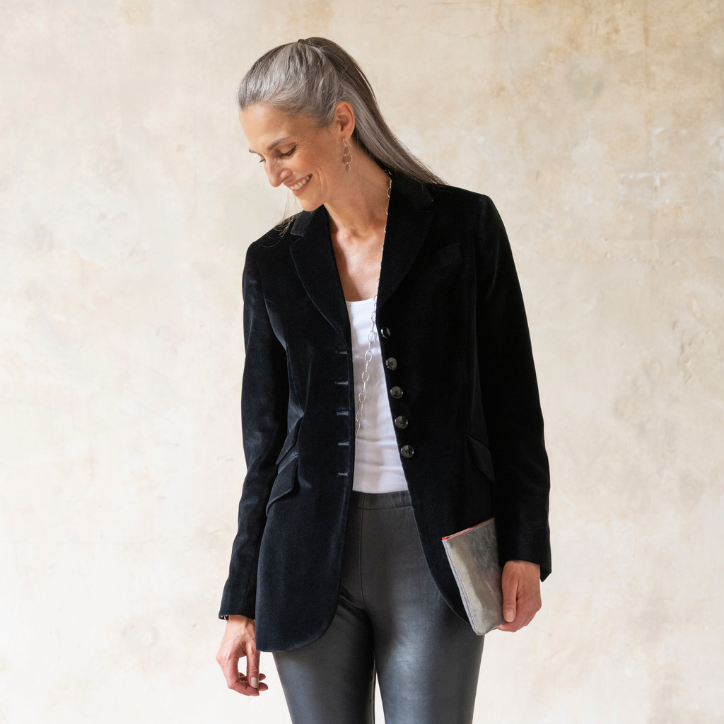 Schwarzer, tailliert und etwas länger geschnittener Blazer aus schwarzem Samt aus reiner Baumwolle. Zu einem Tweedrock oder weniger formell zu Jeans oder Lederhose. Fallendes Revers, drei Knöpfe, schräge Taschen mit Billetttasche, Brusttasche, Innentasche, 2 Rückenschlitze und schwarzes Innenfutter.