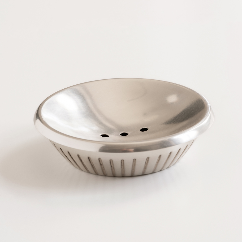 Für diese sechsteilige Badezimmerserie aus versilbertem Messing stand eine Teekanne im Queen-Anne-Stil Pate mit der markanten, sich aus dem Boden entwickelnden Rillenprägung und der sich in elegantem Schwung nach unten verjüngenden Form. Obgleich Queen Anne Stuart das britische Königreich schon zu Beginn des 18. Jahrhunderts regierte, fand der ihr zugeordnete Stil erst im letzten Viertel des 19. Jahrhunderts in England und Amerika seine weiteste Verbreitung.