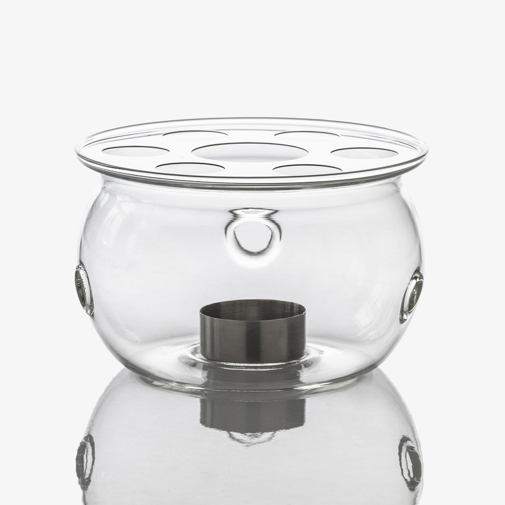 Stövchen mit herausnehmbarem Einsatz für Teelichter und einer Aluminiumplatte als Träger für die Kanne. Hitzebeständig, mikrowellengeeignet und von hoher Bruchsicherheit. Glas eignet sich gut für Gefäße, die mit Tee in Berührung kommen, da sich die glatte, porenfreie Oberfläche leicht reinigen lässt. Sind außerdem Temperaturbeständigkeit und Bruchfestigkeit gefragt, ist Borosilikatglas das ideale Material: Es trotzt auch plötzlichen Temperaturschwankungen, ist außergewöhnlich kantenstabil, lässt sich dünn verarbeiten und trübt aufgrund seiner hohen Säure- und Laugenbeständigkeit nicht ein. Es kommt daher vor allem als Labor- und Behälterglas in der chemischen Industrie zum Einsatz, war Bestandteil der Hitzeschutzkacheln der Space Shuttles und hält schließlich auch den härtesten Anforderungen im eigenen Haushalt tadellos stand: Dem regelmäßigen Kontakt mit Geschirrspülmaschine und Mikrowellenherd.