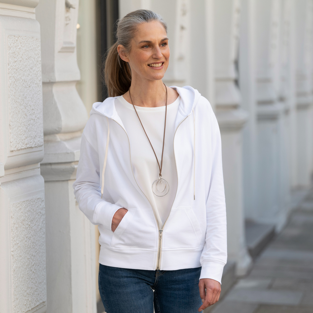 Die perfekte Hoodie-Variante für alle, die ungern Kleidungsstücke über den Kopf ziehen. Dieser Hoodie bietet mit Kapuze mit Zugbändern und zwei großen, vorne aufgesetzten Taschen für die Hände alles, was man von einem Hoodie für entspannte Stunden erwarten darf. Und einen durchgehenden Frontreißverschluss für schnelles An- und Ausziehen. Bequemer, innen flauschiger Jerseystoff aus 95 % Baumwolle und 5 % Elasthan. Von Sunday in Bed in München.