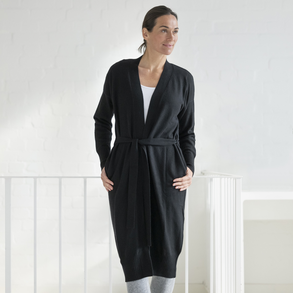 Langer, leger und puristisch geschnittener Mantel aus 70 % Wolle (Merino) und 30 % Kaschmir. Ein herrlich wärmendes Kleidungsstück, das dennoch eine lässige Eleganz nicht vermissen lässt – somit auch nicht vergleichbar mit einem „Hausmantel“. Dieser Mantel darf (und sollte!) die eigenen vier Wände verlassen. Ein Gürtel ermöglicht vollständig oder halb geschlossenes Tragen. Breite Rippenbündchen an den Ärmeln und am unteren Saum. Der Mantel reicht ungefähr bis knapp unter das Knie (Länge bei Größe S: 115 cm). Handwäsche.