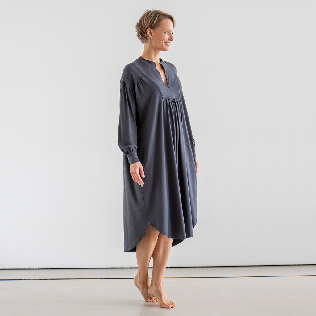 Mit liebevollen Details ausgestattetes, aufwendig verarbeitetes Nachthemd, das durch viele drapierte Falten weit und fließend fällt. Seine Länge reicht bis unter die Knie, so dass man sich auch am Tag in der Wohnung oder im Haus angezogen fühlt. Der weiche Jerseystoff liegt angenehm weich auf der Haut. Mit Stehkragen, V-Ausschnitt, Brustlatz, überschnittenen Schultern, leichten Ballonärmeln und breiten, eng abschließenden Ärmelbündchen. Länge geht über die Knie.