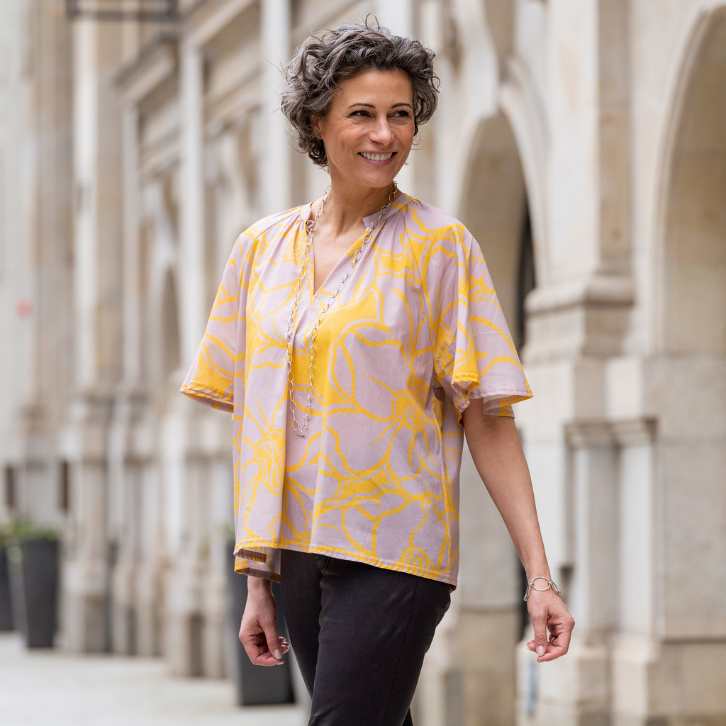 Luftiges, verspielt geschnittenes Top mit weiten, halblangen Ärmeln und großflächigem, sattgelbem Blütenmuster auf taupefarbenem Grund. Das Top passt besonders gut zu schlichten langen oder kurzen Hosen. Kleine, geraffte Details am weiten Halsausschnitt, der je nach Style und Anlass auch geschlossen werden kann.