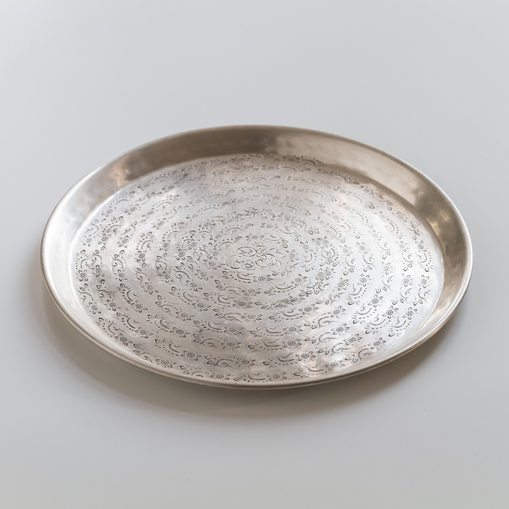 Orientalisch anmutendes Tablett mit versilberter, patinierter Oberfläche und filigranem Blumenranken-Dekor. Das Muster wird von Hand mit einem immer wieder angesetzten Punzierstempel von der Mitte aus spiralförmig mittels gezielter Hammerschläge eingebracht – eine Technik, die unvermeidlich zu Unregelmäßigkeiten führt und das Dekor gerade deshalb äußerst lebendig wirken lässt.