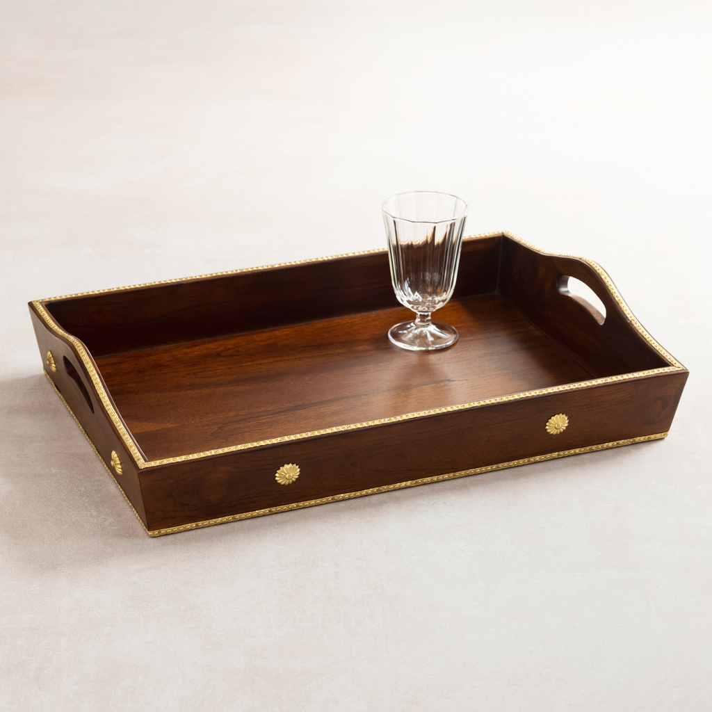 Ein Tablett aus dunklem Teakholz und Messing, das förmlich nach Whiskeygläsern, Aschenbechern und Zigarren in schummrig gemütlicher Kaminatmosphäre ruft. Die obere und untere Kante wird durch glänzende, geprägte Messingbänder verziert, die Seitenwände sind mit je zwei Messingrosetten verziert. FSC-zertifiziertes Teakholz mit Walnussfinish, seidenmatt lackiert, großzügige Griffe an den Schmalseiten.
