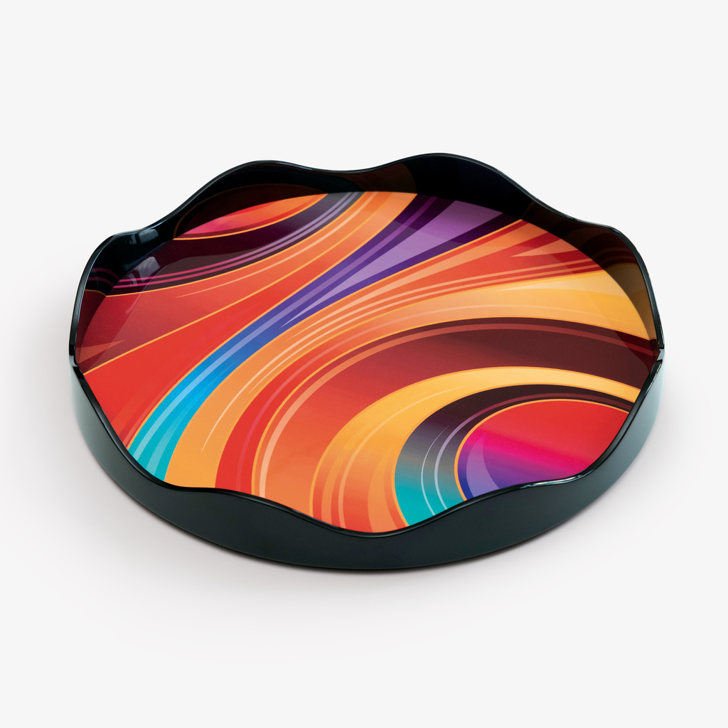 Eine Hommage an die 1970er Jahre: Mit seinem dynamischen Muster in satten Farbtönen und dem gewellten Rand ist dieses ausdrucksstarke Tablett wie gemacht für besondere Anlässe. Aus hochglanzlackiertem Holz gefertigt, mit vier rutschfesten Gummifüßchen.