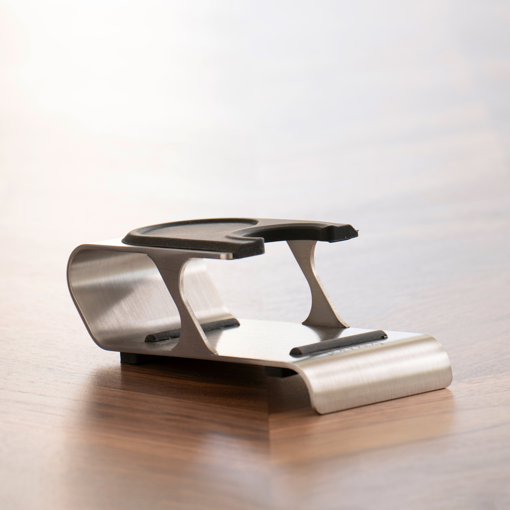 Bietet maximale Stabilität beim Pressen des Espressomehls im Siebträger und verhindert Kratzer in der Arbeitsplatte: Tamperstation mit halbrunder, silikongepolsterter Siebträgeraufnahme, vier Silikonfüßen für rutschfesten Stand und rund nach unten geformtem Vorderteil, mit dem die Station an der Kante der Arbeitsplatte angesetzt werden kann. Tamperablage aus Silikon.