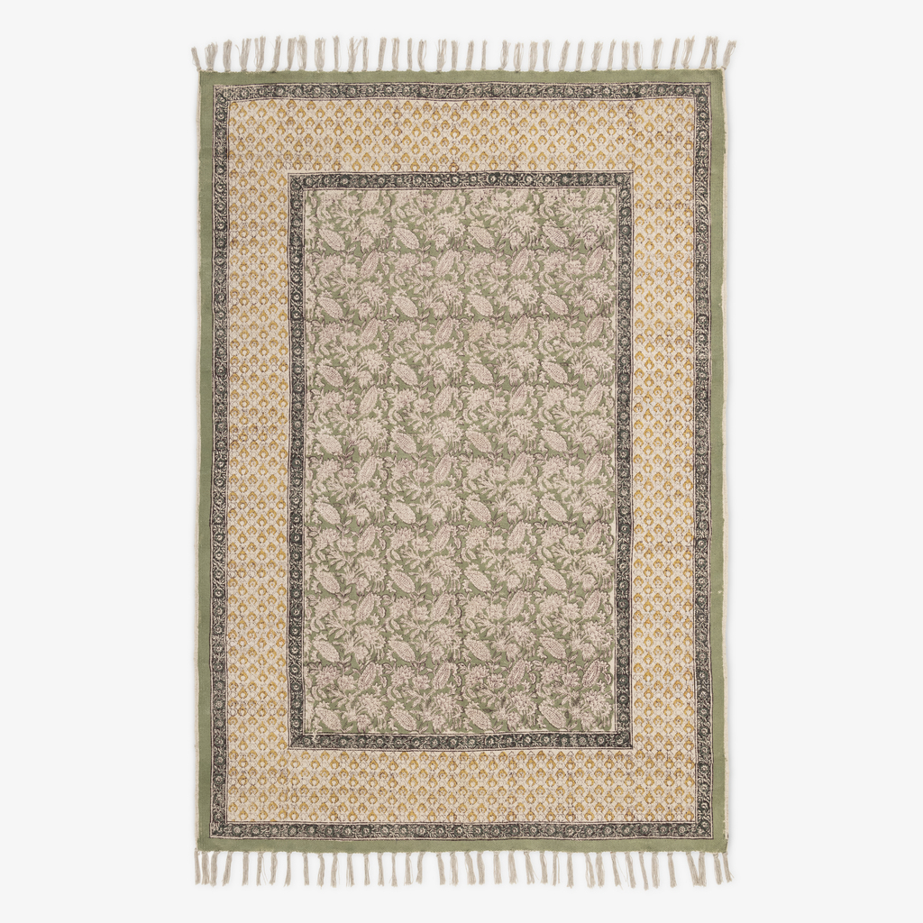 Gefertigt wird der Teppich aus reiner, dicht gewebter Baumwolle. Sein detailreiches Muster entsteht im traditionellen Block-Print-Verfahren, bei dem jeder einzelne Holzstempel von Hand auf den Stoff gesetzt wird. Leichte Unregelmäßigkeiten in Farbauftrag und Rapport sind dabei kein Makel, sondern ein charakteristisches Zeichen dieser aufwendigen Handarbeit. Die flache Webart schließt an den Kanten mit kurzen, gedrehten Fransen ab.