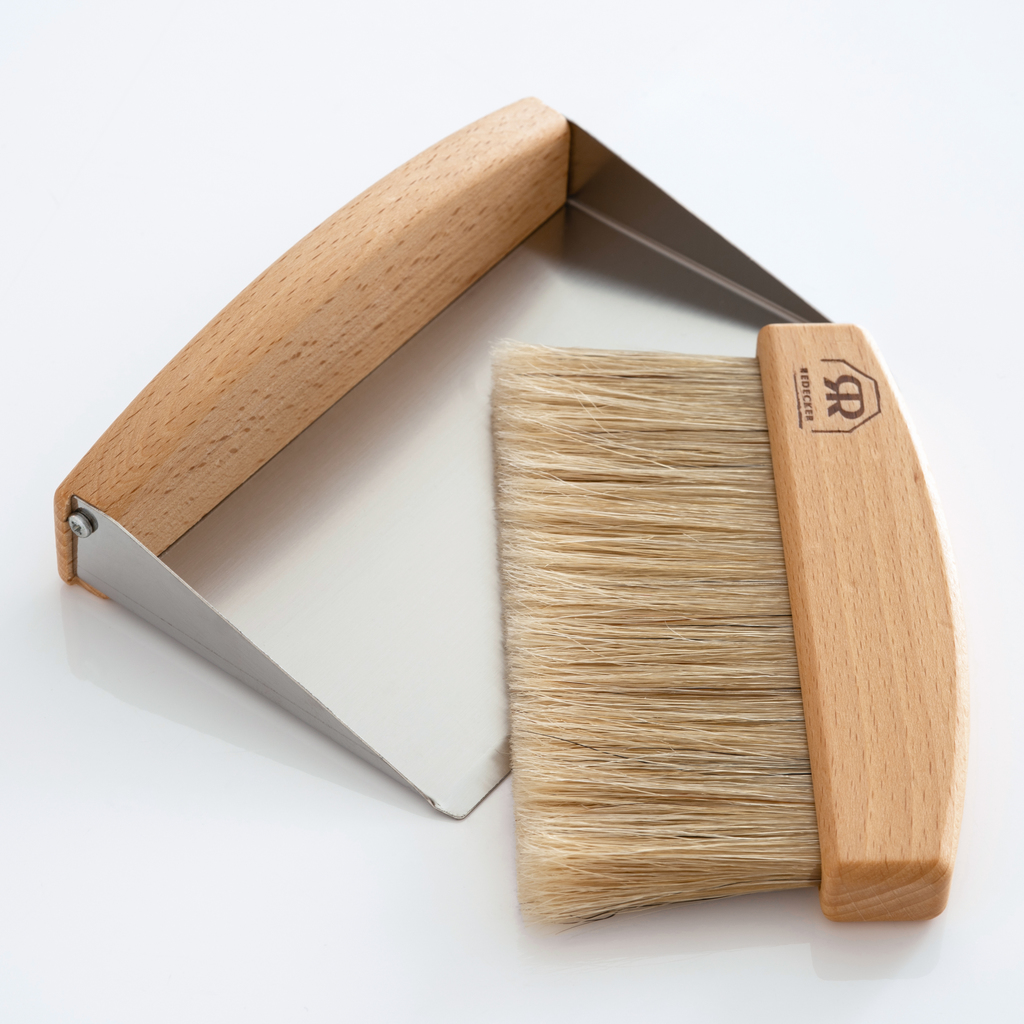 Kleiner Besen und Schaufel zur Beseitigung von Krümeln von Ess- oder Küchentisch. Praktisches Detail: Das Kehrset passt genau ineinander und wird magnetisch zusammengehalten. Geöltes Buchenholz, Edelstahl, Naturborsten, produziert in Deutschland.
