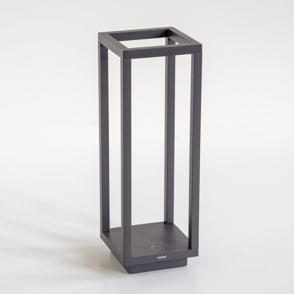 Ihre Form erinnert an eine Laterne, die Funktion dieser tragbaren Leuchte ist aber ganz zeitgemäß auf kabellosen LED-Akku-Betrieb ausgerichtet. Die LEDs sind im oberen Teil des puristischen Aluminiumrahmens platziert und strahlen ein warmes, indirektes Licht nach unten ab, das durch die Berührung der Basis ein- und ausgeschaltet sowie gedimmt werden kann. Sie kann drinnen und draußen als Tisch- oder Bodenleuchte dienen und wie die gute alte Laterne überall mit hingenommen werden, wo etwas Licht gebraucht wird. Bei maximaler Leuchtkraft spendet sie ca. 12 Stunden Licht und braucht 6 bis 8 Stunden zum Wiederaufladen auf der mitgelieferten Kontaktladestation.