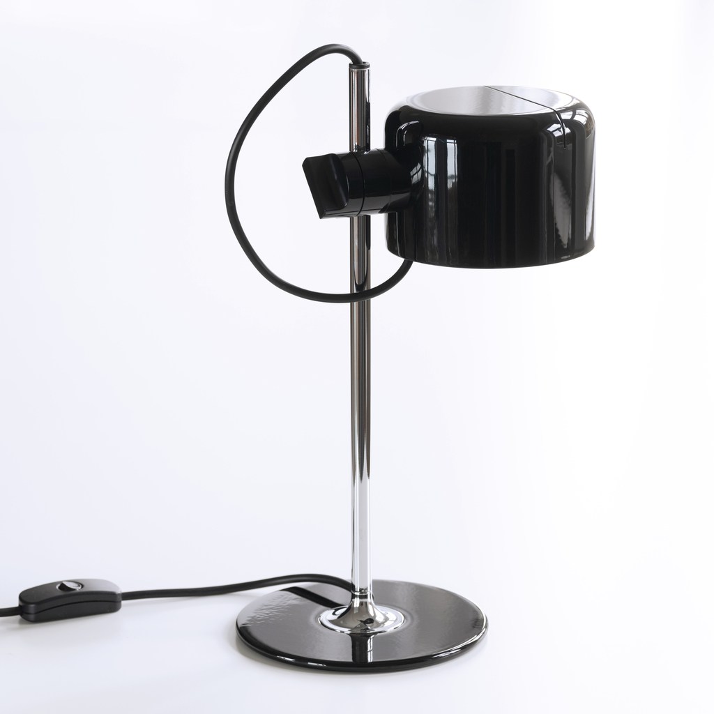 Verkleinerte Neuauflage eines ikonischen Designs aus der Hand des Industriedesigners und Architekten Joe Colombo (1930 bis 1971), der für seine futuristischen, revolutionär dynamischen Entwürfe bekannt ist. Ein flacher Fuß aus lackiertem Metall, ein schlanker Stiel aus verchromtem Stahl und ein verstellbarer Schirm aus lackiertem Aluminium, der direktes Licht nach unten abgibt. Joe Colombos Coupé wurde unmittelbar nach ihrem Erscheinen mit dem International Design Award ausgezeichnet und steht heute im MoMA in New York und in der Neuen Sammlung in München. Die 2021 von Oluce neu herausgebrachte Mini Coupé eignet sich vor allem als Leuchte auf dem Nachttisch oder für einen kleinen Arbeitsplatz: Der höhen- und neigungsverstellbare Schirm erlaubt eine fokussierte und absolut blendfreie Ausrichtung, ein schmaler Ausschnitt auf der Oberseite des Schirms lässt zudem auch einen leichten Lichtschein nach oben austreten. Für Leuchtmittel G9, max. 3 W (nicht enthalten).