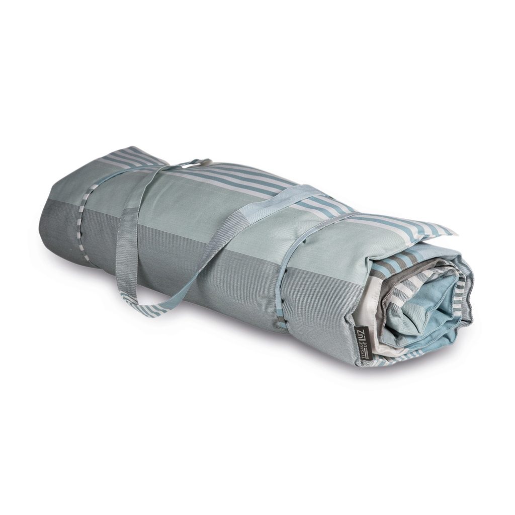 Wattierte Matten in typisch baskischem Streifenmuster, auf denen sich ganze Tage am Strand, auf einer Liege oder am Pool verbringen lassen. Aufrollbar und mit Tragehenkel, so dass man auf dem Weg zum Ort des Sonnenbads keine Mühe damit hat. Die Matten stammen von Tissage de Luz in Espelette im französischen Baskenland.