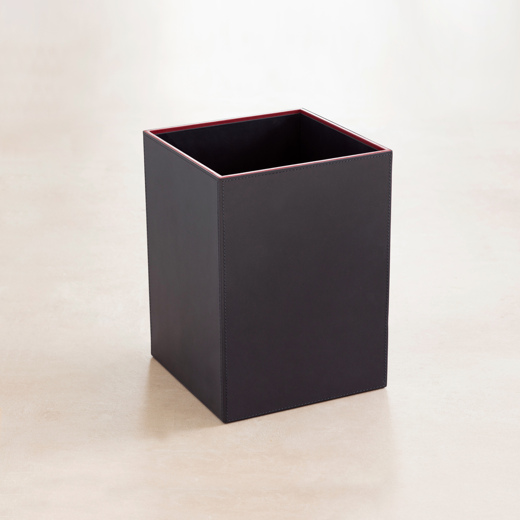 Papierkorb mit sehr hochwertiger Anmutung, der sich in jeden Einrichtungsstil wunderbar einfügt, ohne sich in den Vordergrund zu drängen. Die sichtbaren Flächen sind jeweils mit dunkelblauem Leder bezogen und mit roten Kanten versehen – das Material fasst sich angenehm an und altert schön. Die Unterseite ist mit rutschhemmendem, angerautem Kunstleder belegt.