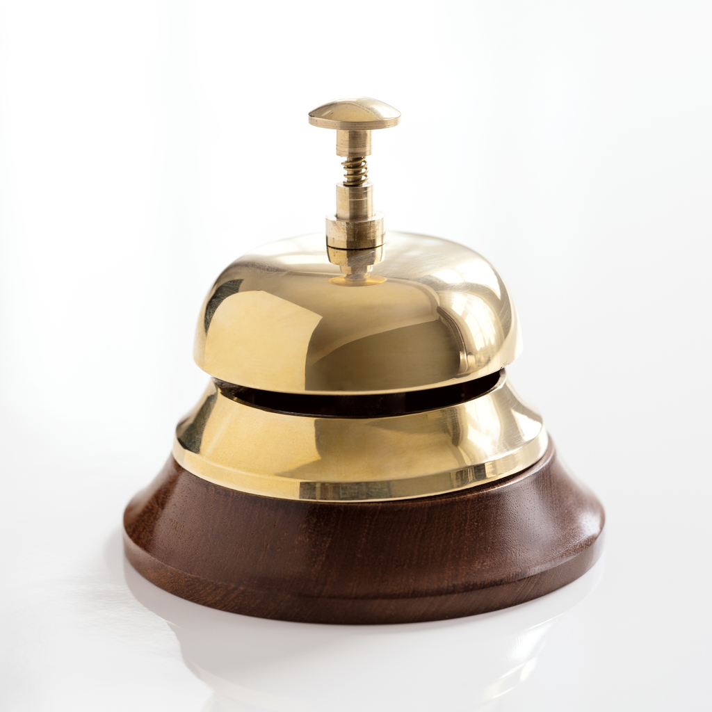 Klassische Tischglocke, wie man sie auch heute noch an Hotelrezeptionen oder Verkaufstresen findet. Das Glockengehäuse aus poliertem Messing sitzt auf einem massiven Sockel aus dunkel gebeiztem Holz. Schlägt man ihren klaren, hohen Ton durch leichtes Drücken des Knopfes an, ist weithin hörbar, dass Aufmerksamkeit gewünscht ist: „Kundschaft!“