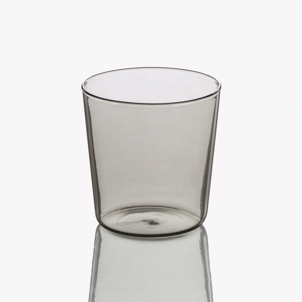 Diese Gläser aus hochwertigem durchgefärbtem Borosilikat ergänzen jedes Service dank ihrer minimalistischen Form. Ende des 19. Jahrhunderts von Chemiker und Glastechniker Otto Schott entwickelt, bewährte sich Borosilikatglas dank seiner hitzebeständigen und chemikalienresistenten Eigenschaften zunächst in Chemielaboren und in der Forschung. Mitte des 20. Jahrhunderts wurde es auch für die Herstellung von Haushaltsgegenständen entdeckt. Borosilikat ist langlebiger sowie widerstandsfähiger gegen Kratzer und Abrieb als herkömmliches Glas, es ist leicht zu reinigen, nimmt keine Gerüche oder Geschmäcke an. Das Glas lässt sich über den Hals der Karaffe stülpen.