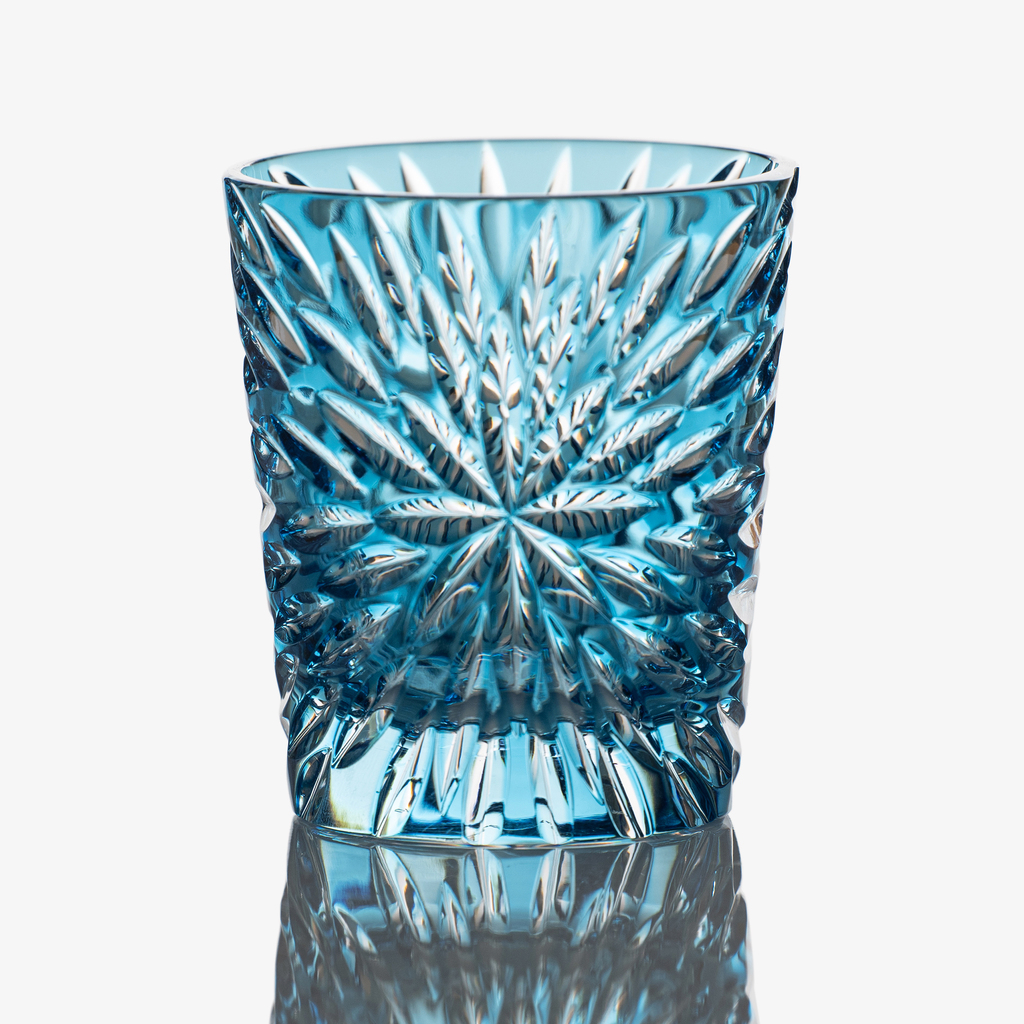 Ein von Hand geschliffenes Glas hat etwas Besonderes, das in maschineller Fertigung nicht erreicht werden kann. Das explosionsartige Muster, das aus der Farbschicht herausgearbeitet ist, verleiht diesen Trinkgläsern ihre charakteristische, moderne Wirkung. Die eigentliche Kunst dieser wohl aufwendigsten Form der Glasveredelung beginnt nach dem Überfangen des Kristallglas-Rohlings mit einer dünnen Schicht aus farbigem Glas. Erfahrene Schleifer arbeiten in reiner Handarbeit das feine, strahlenförmige Muster in das Glas. Durch den präzisen Schliff kommt das helle Kristallglas unter der Farbe zum Vorschein und erzeugt das gewünschte Muster. Diese aufwendige Technik steht in der Tradition böhmischer und schlesischer Glaskunst, die heute nur noch wenige Manufakturen beherrschen.