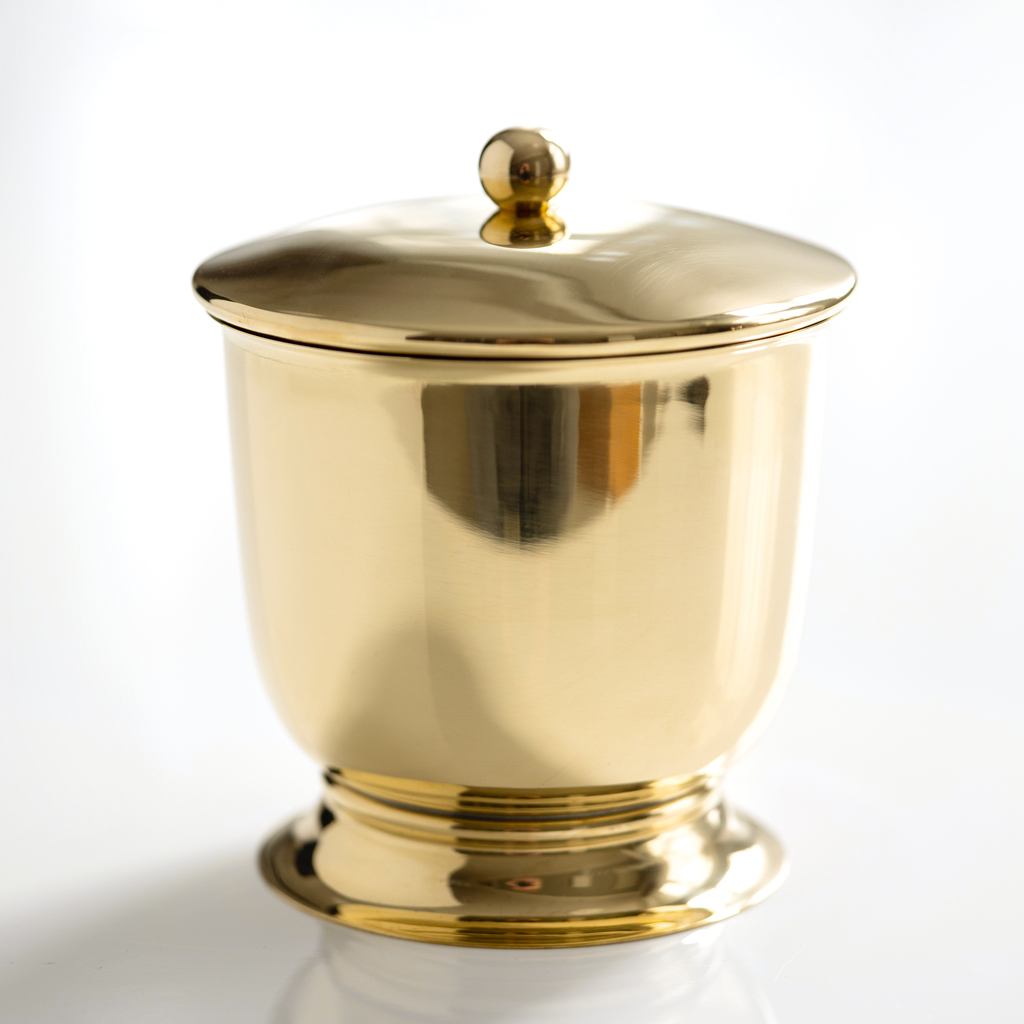 Badaccessoires aus poliertem, massivem Messing, die in ihrer Formensprache des ausgehenden 19. Jahrhunderts in Frankreich erinnern: ein schlichter, zylindrischer Becher mit leicht ausladendem Rand auf einem kleinen Sockelfuß. Das Messing ist bewusst nicht mit einem Anlaufschutz ausgestattet, sodass sich mit der Zeit eine schöne Patina entwickelt. Um den Glanz der Oberfläche zu erhalten, ist gelegentliches Polieren mit Messingpolitur notwendig.