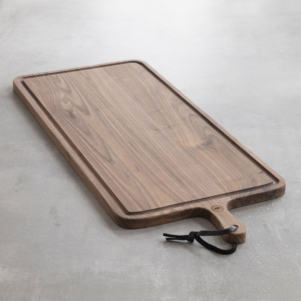 Außergewöhnlich schöne Servierbretter aus rötlich bis dunkelbraun gemasertem Walnussholz, das sich dank seiner guten Säurefestigkeit hervorragend zum Servieren von kalten Speisen eignet – zusätzlich sind die Bretter mit geruchs- und geschmacksfreiem Traubenkernöl behandelt. Walnussbäume werden trotz der ansprechenden Struktur, der Zähigkeit und der guten Verarbeitungseigenschaften ihres Holzes fast ausschließlich zur Nussgewinnung angebaut und nur dann gefällt, wenn sie nicht mehr tragen. Das seltene Holz wird meist nur als Furnier verwendet – entsprechend ungewöhnlich und wertvoll sind Werkstücke aus Vollholz. Mit Griff und Band zum Aufhängen.