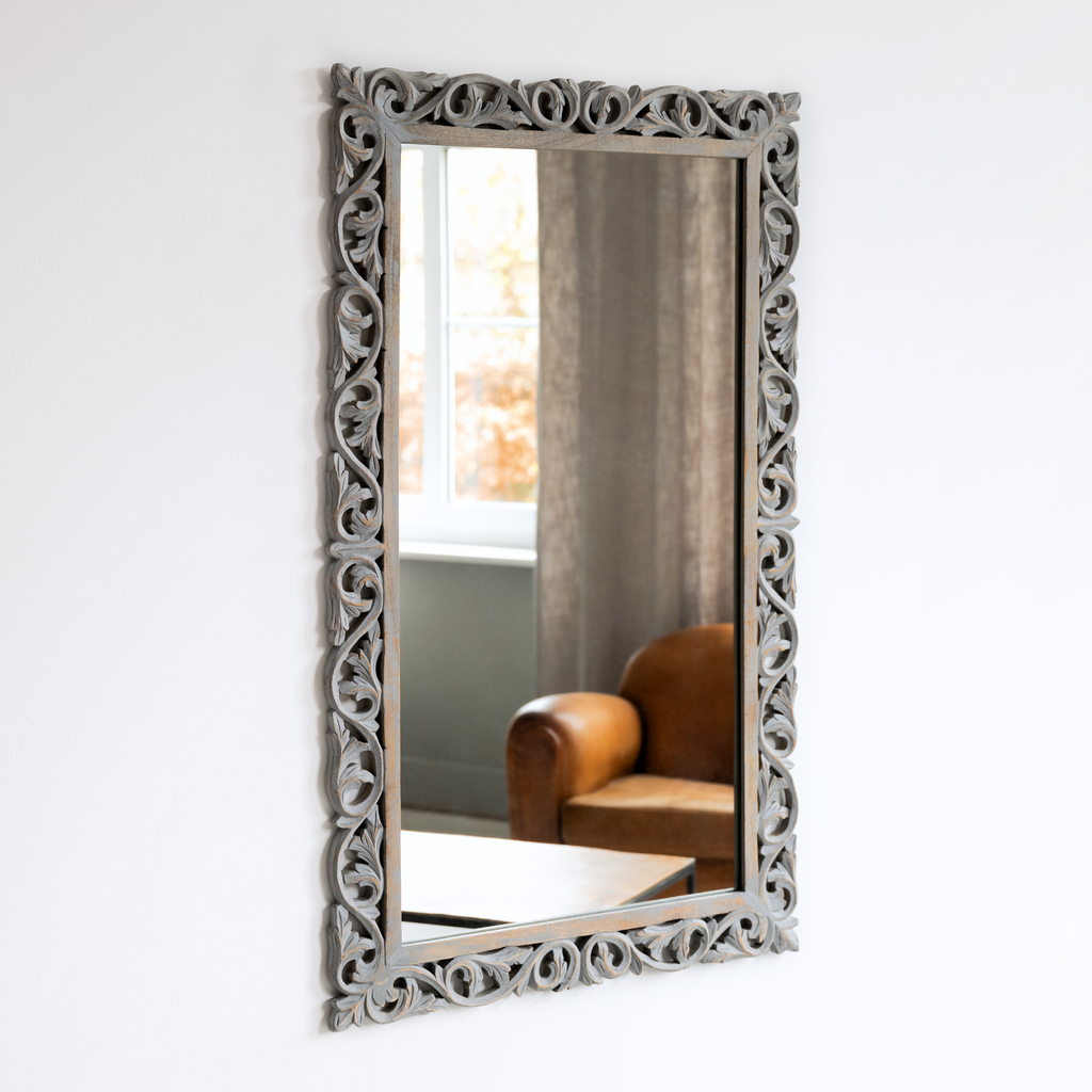 Großer Wandspiegel mit aufwendig geschnitztem Holzrahmen und Vintage-Finish. Die Inspiration zu seinem ungewöhnlichen Namen stammt von den Reliefs aus rankenden Akanthusblättern am Altar des Friedens in Rom (lat.: „Ara Pacis“), der im 9. Jahrhundert zu Ehren von Kaiser Augustus aufgestellt wurde. Die Vintage-Bearbeitung des Rahmens kommt dagegen aus dem Hier und Jetzt: Dafür wird das helle Mangoholz nach einem matt-grauen Anstrich an den erhabenen Stellen des Schnitzwerks wieder frei geschliffen. Das Rankenornament sieht so besonders plastisch aus und erhält fast golden anmutende Highlights. Außenmaße 135 x 78 cm, Spiegelfläche 118 x 60 cm.
