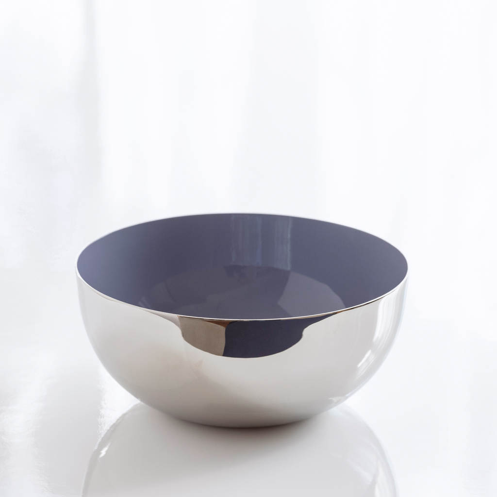 Schlichte Schalen aus massivem Messing, die innen mit einer Schicht aus Kaltemaille überzogen und außen vernickelt sind. Kaltemaille findet sich ansonsten vor allem in der Schmuckherstellung, wo normalerweise nicht mit heißer Glasschmelze gearbeitet werden kann. Die Farbpigmente werden hier zusammen mit hochwertigem Kunstharz verarbeitet, wie man es z. B. von teuren Schreibgeräten kennt. Solcherart hergestellte Kaltemaille lässt sich außerordentlich glatt verarbeiten und bietet einen herrlichen, tiefen Farbglanz. Die Außenseite ist hochglanzpoliert, mit einer Schicht Schutzlack überzogen und zeigt den für Nickel typischen, sich von Chrom oder Silber durch eine minimal wärmere Nuance abhebenden Farbton.