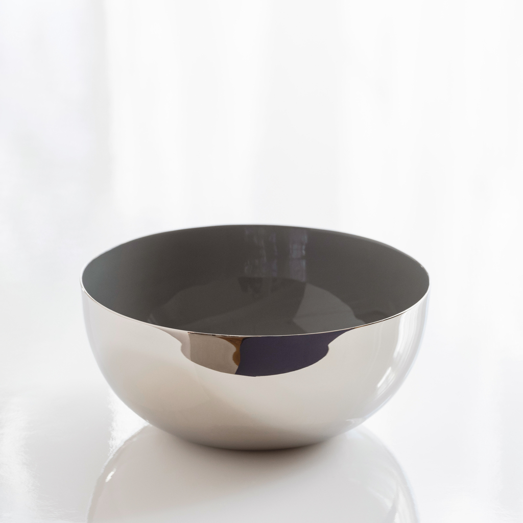 Schlichte Schalen aus massivem Messing, die innen mit einer Schicht aus Kaltemaille überzogen und außen vernickelt sind. Kaltemaille findet sich ansonsten vor allem in der Schmuckherstellung, wo normalerweise nicht mit heißer Glasschmelze gearbeitet werden kann. Die Farbpigmente werden hier zusammen mit hochwertigem Kunstharz verarbeitet, wie man es z. B. von teuren Schreibgeräten kennt. Solcherart hergestellte Kaltemaille lässt sich außerordentlich glatt verarbeiten und bietet einen herrlichen, tiefen Farbglanz. Die Außenseite ist hochglanzpoliert, mit einer Schicht Schutzlack überzogen und zeigt den für Nickel typischen, sich von Chrom oder Silber durch eine minimal wärmere Nuance abhebenden Farbton.