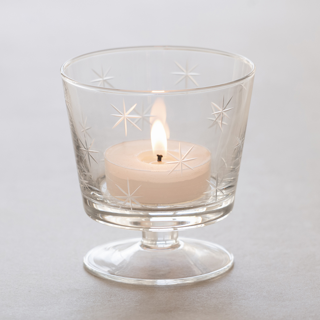 Winterliches Windlicht in Form eines Kelchs mit niedrigem Fuß und von Hand eingeschliffenen Sternen in verschiedenen Formen und Größen. Für handelsübliche Teelichte mit einem Ø von bis zu 7 cm (Maxi-Teelichte).