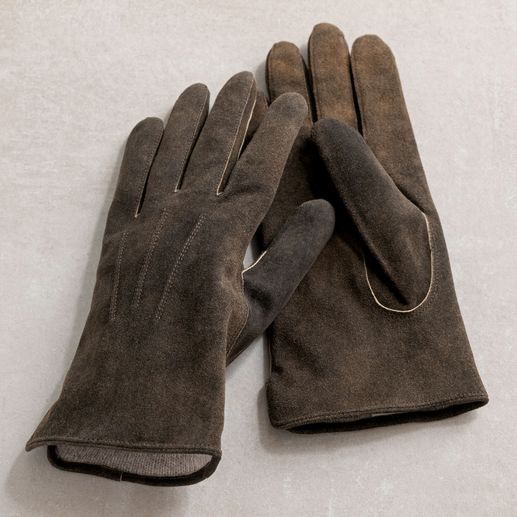Diese klassisch-schlichten Handschuhe von Thomas Riemer aus Wien sind ein Basic für eine Herrengarderobe in Herbst und Winter. Durch die Verarbeitung mit Nähmaschine erreicht Riemer eine exzellente Passform und sehr feine, unauffällige Nähte. Walnussfarbenes, weiches, winddichtes Ziegenleder mit gleichfarbigen Ziernähten, Kaschmirfutter beige, seitlich geschlitzt für komfortables An- und Ausziehen.